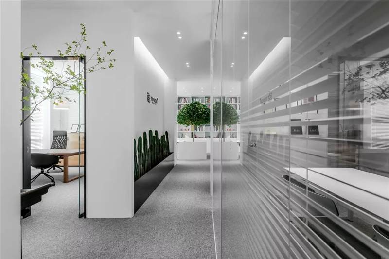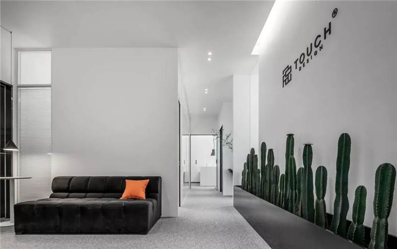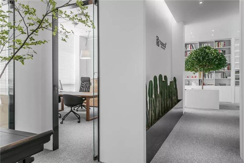 刪繁就簡,以最經(jīng)典的白色為主題搭配色調(diào),沒有繁瑣的設(shè)計和過多的裝飾,減去辦公中的壓抑感。通過將自然純凈的白色與沉靜黑色相結(jié)合,將品牌形象簡潔地呈現(xiàn)表達(dá),同時為左右空間的過渡創(chuàng)建和諧觀感。純白的墻面,接近心靈的澄凈;仙人掌是視覺的焦點(diǎn),恣意生長、堅韌、夯實根基,也正寓意著公司的設(shè)計理念:有所依、有所仗、有所長。