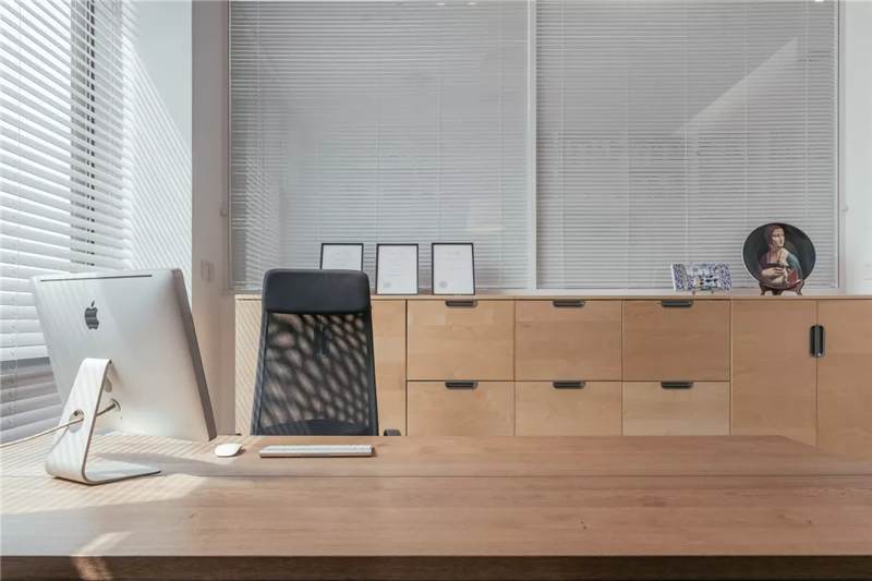 自由無拘的溝通對于團(tuán)隊的創(chuàng)新至關(guān)重要。開放的辦公區(qū)是有效獲取信息和激發(fā)靈感的地方。百葉窗折射的光影,充足的自然光營造高效的工作環(huán)境。空間雖然有限,但發(fā)揮最大的性能,開辟出一整面的軟裝材料搭配區(qū)。