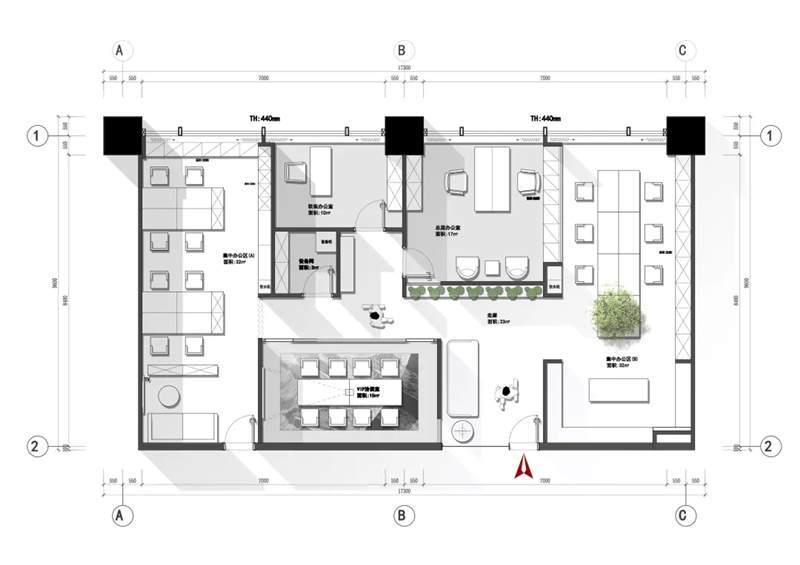 另一側(cè)的空間則增添了二三分私密性。沉穩(wěn)的木質(zhì)案桌上,擺放的綠枝椏仿若思想的觸手,與仙人掌、小株綠植串聯(lián)起空間動線。區(qū)域內(nèi)各自獨(dú)立,用玻璃門分隔開,在保證個人能最大限度沉浸思維創(chuàng)作的同時,又能及時地與伙伴交流互換,碰撞不同的思想。