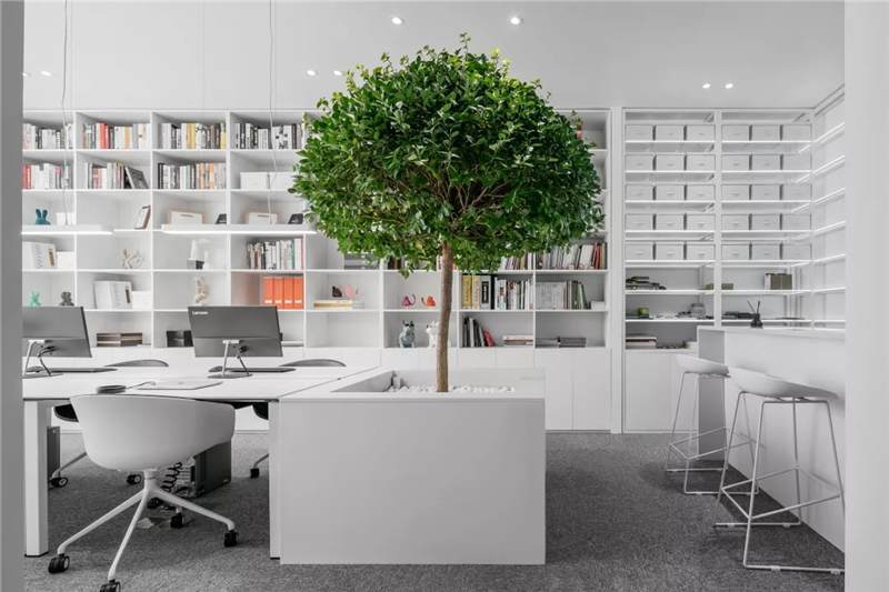在這里,未知的一切與既有的常識記憶產(chǎn)生傳導(dǎo),想象思維的觸角開始蔓延。小株綠樹分隔出挑高的白色高座式二人桌,提供了一種更為隨性、更利于面對面交流的辦公形式。