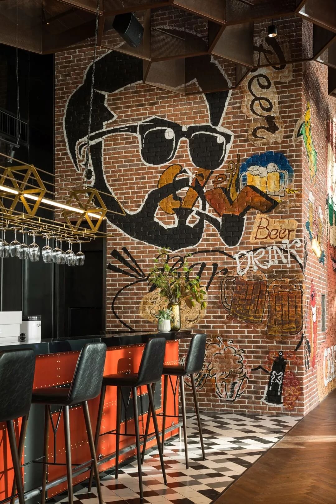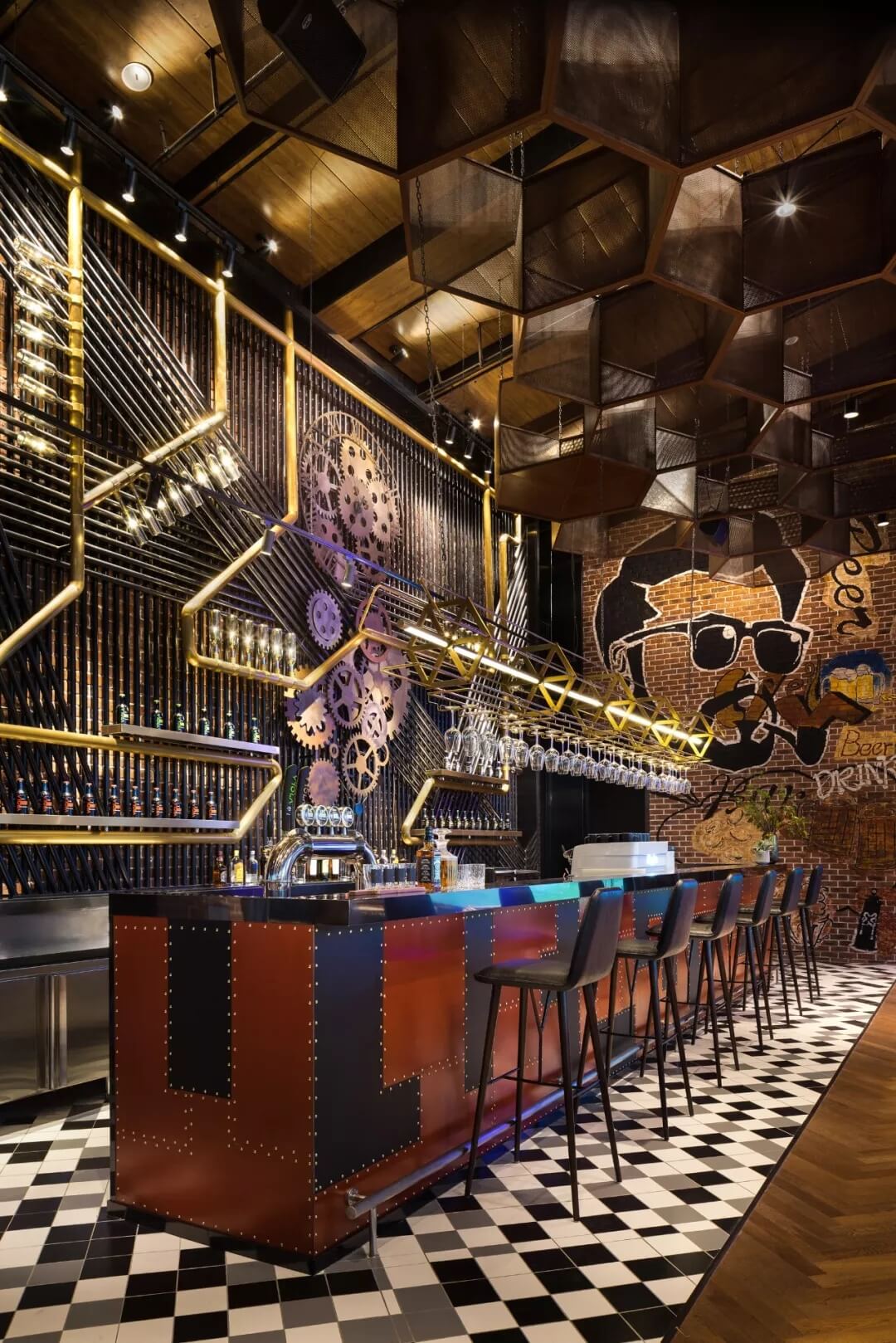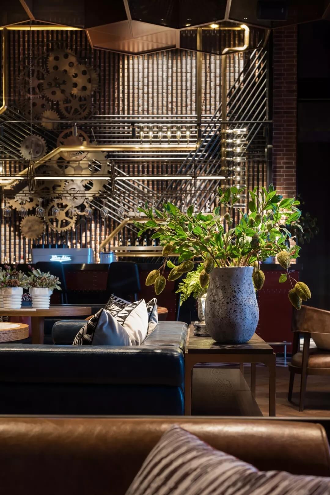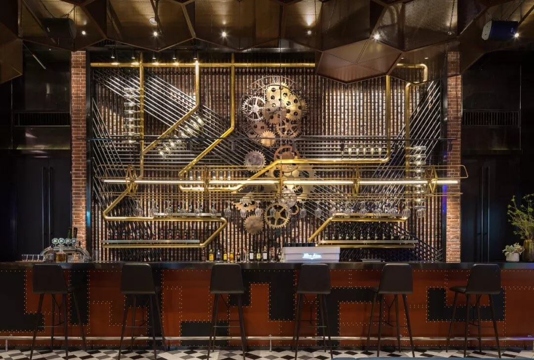 工業(yè)風的精髓在于,在原空間樸拙素簡的本真狀態(tài)下延展其自由隨性的氣質(zhì),在粗獷的空間架構(gòu)中消解拘束感,呈現(xiàn)出大氣又不失細膩的美感。粗礪的紅磚墻、朋克夸張的墻畫涂鴉、裸露的管道線路、復古做舊的齒輪掛件、紅黑交接的鉚釘吧臺......統(tǒng)攝進工業(yè)風的設計常規(guī)之中。