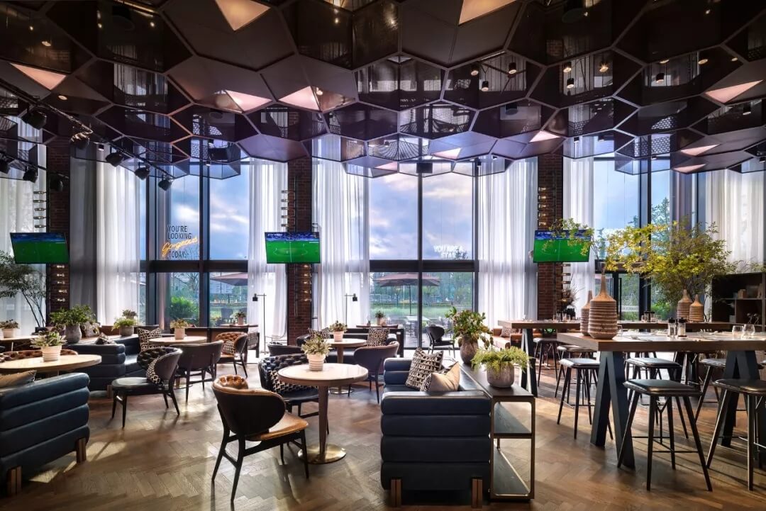 設計將足球的六邊形化用于天花的裝飾上,立體幾何的體量、金屬線條的質(zhì)感賦予了社交空間的適當距離感。多幅大屏幕的配置,讓聚于此的人們,沉浸于啤酒吧和比賽現(xiàn)場的氛圍當中,盡情享受在開闊大氣的空間格局中觀摩賽事的自由,為熱愛喝彩,為夢想干杯,傳遞運動不止的精神。