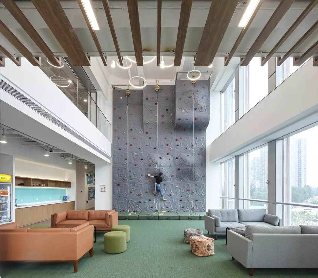 綠籬奇跡島,是自然,健康運動,挑戰(zhàn)自我的主題公共空間。木質(zhì)格柵樓梯在二層延伸出一個通透的格柵BOX,形成豐富的空間層次和視覺高差。同時設(shè)置攀巖墻,瑜伽室和健身房,展現(xiàn)新氧人不懼挑戰(zhàn),運動健康的生活方式。
