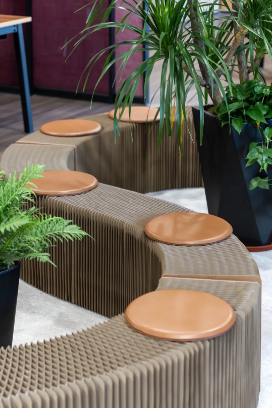 裝置互動區(qū),采用s型手風(fēng)琴形態(tài)展示,可伸縮挪動,搭建起多人會客溝通的場景,在曲折回旋中梳理人文互動的脈絡(luò)。從初始到終結(jié),代表五行木文化的綠植一前一后,維系場域間的平衡與沉穩(wěn)。