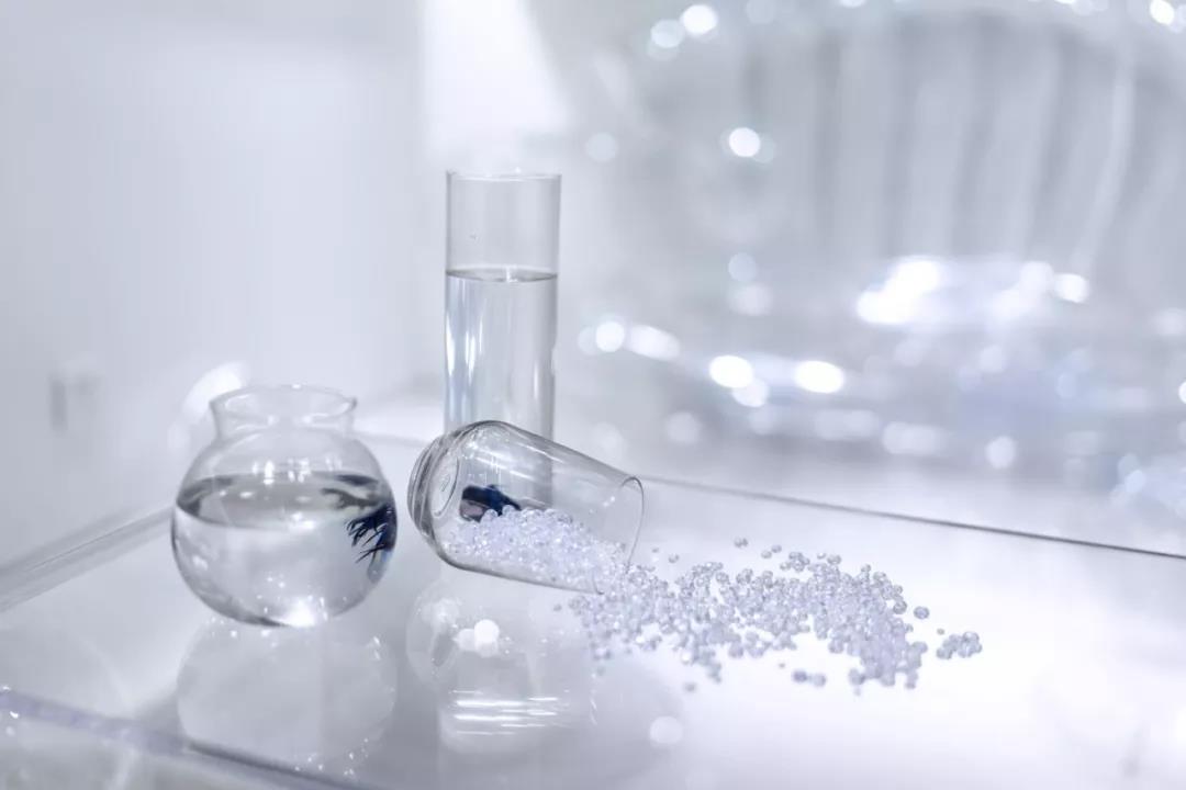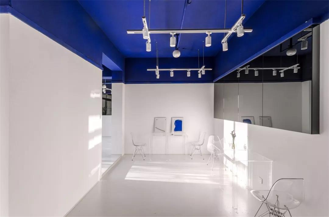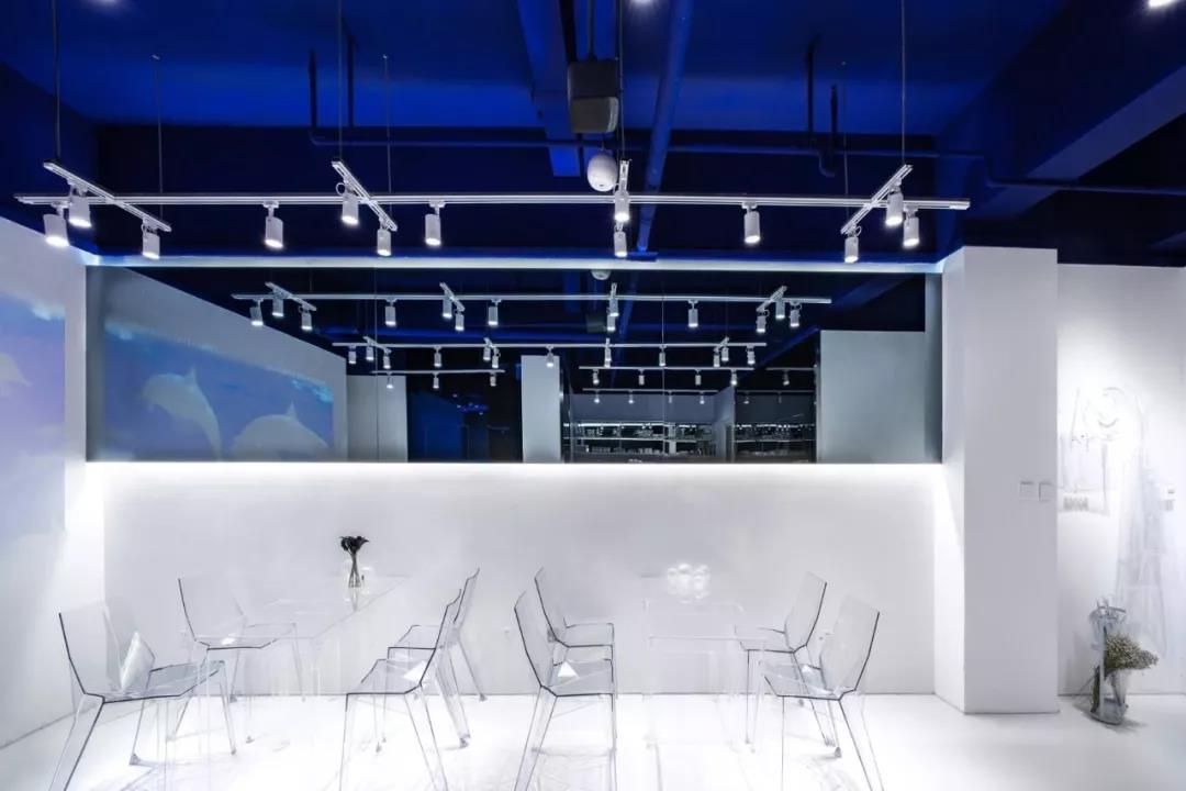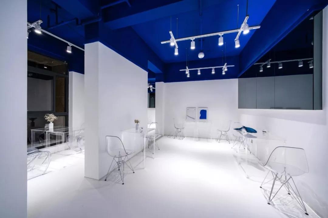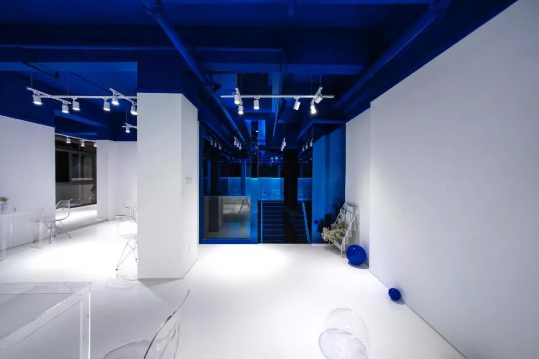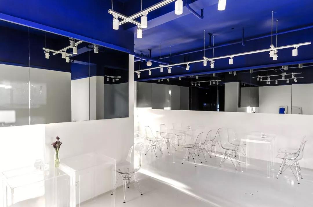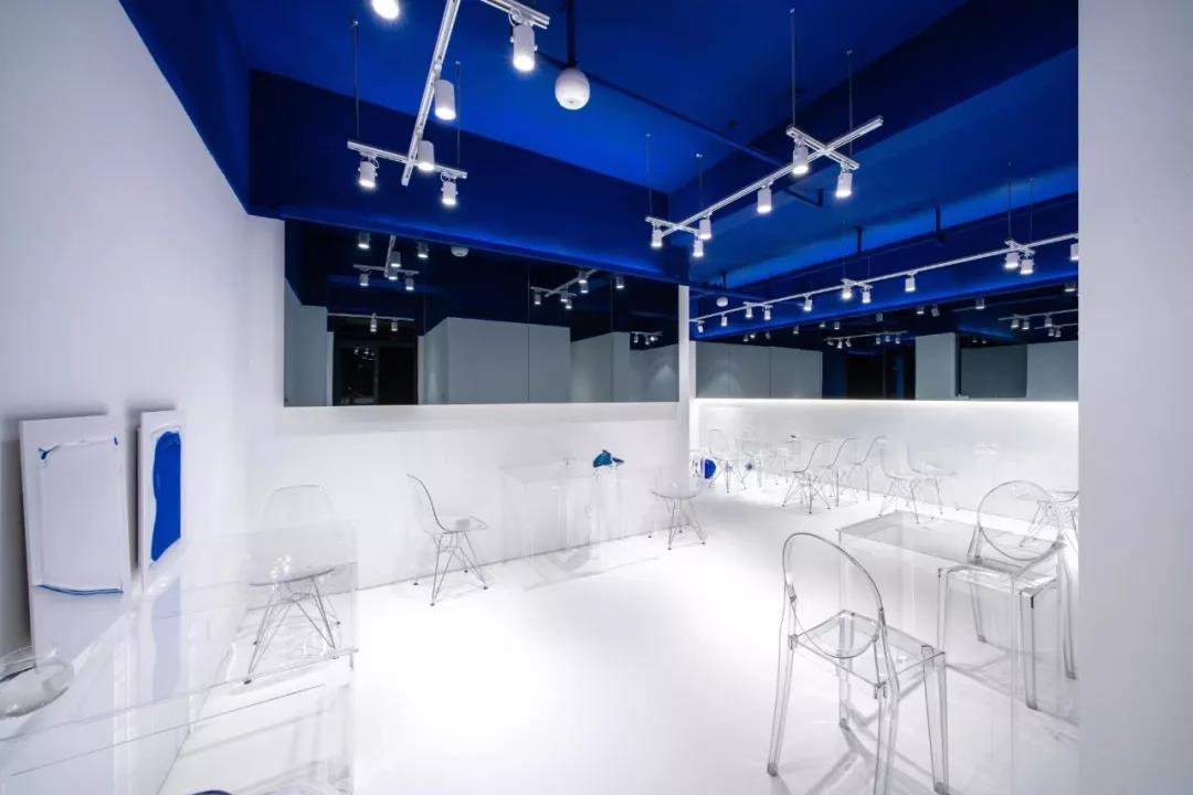 帶著這樣的邏輯,整個(gè)空間的設(shè)計(jì)就很明確了,拆除原有的吊頂,用涂料做成藍(lán)色的“天空”;下面的空間則使用帶有反射性/透明性的材料——鏡面、金屬、亞克力、塑料等,通過(guò)這種曖昧的委婉的,而非簡(jiǎn)單粗暴的方式,讓深海的藍(lán)色充滿(mǎn)整個(gè)空間。
