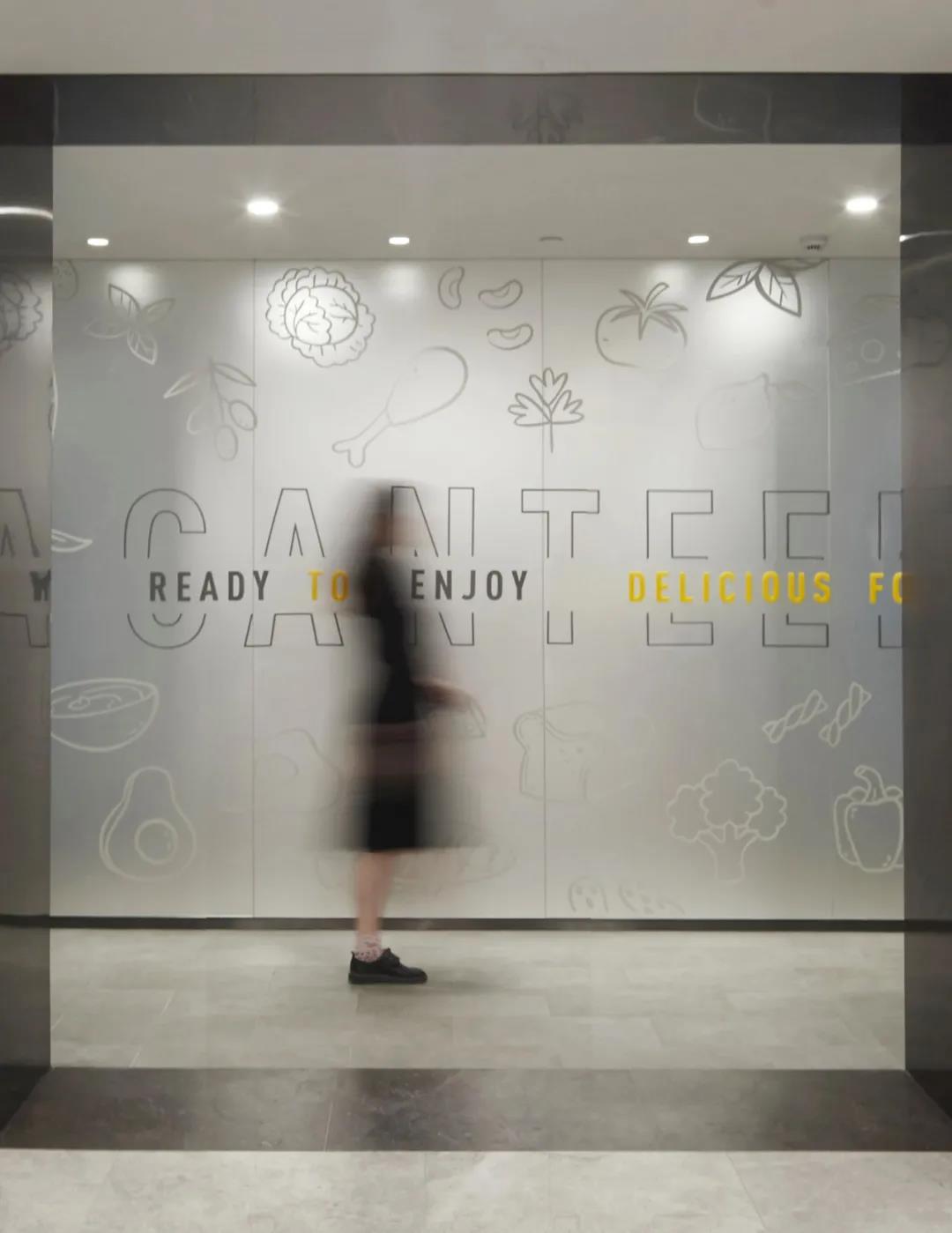 不同于其他辦公樓餐廳布置在地下層,vivo以三層作為生活服務(wù)區(qū),集中布局健身和餐廳,方便管理并對(duì)其他辦公層影響較少。餐廳入口使用磨砂鏡彩繪圖案,指示清晰,內(nèi)部通過(guò)地面鋪磚、桌椅組擺等方式設(shè)置出等候,取餐,就餐,收盤等交通動(dòng)線,維護(hù)空間秩序,營(yíng)造出輕松舒適整潔的就餐環(huán)境。