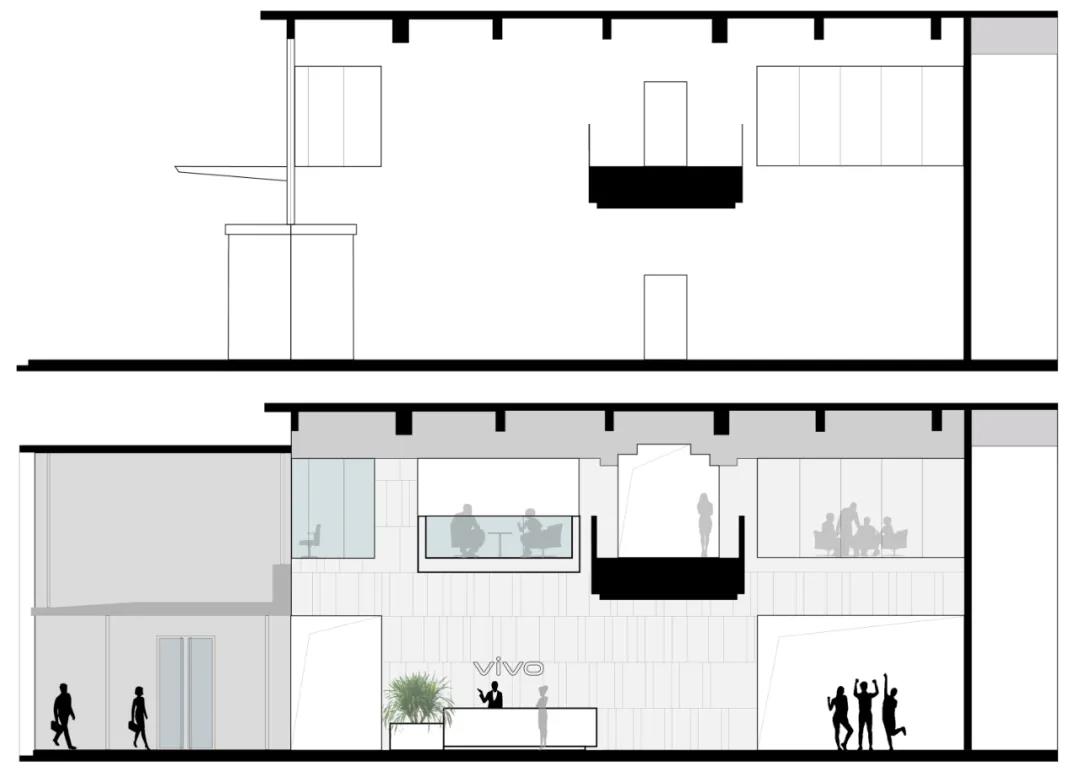 大堂作為整體的對(duì)外開放和形象展示空間,配備了咖啡,休閑茶水,展廳,洽談,會(huì)議等開放的功能性空間,配以圖像視覺(jué)傳達(dá)設(shè)計(jì),軟植入vivo品牌精神。