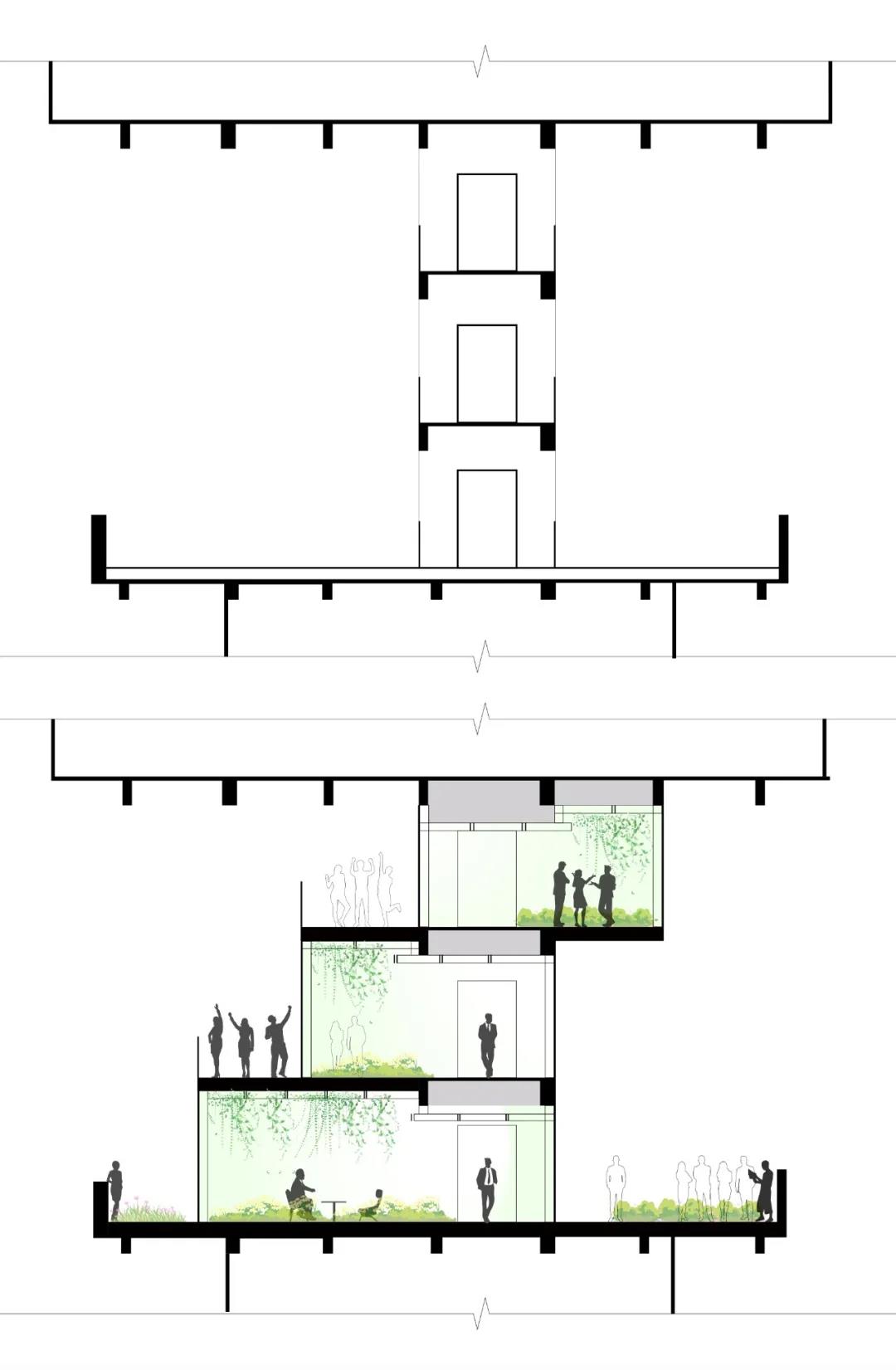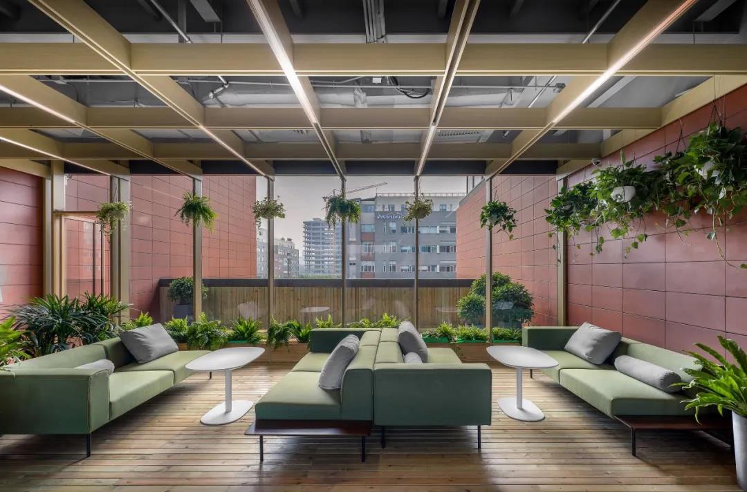 在建筑中段的4-6層,是一處半室外的連橋空間。通過(guò)結(jié)構(gòu)適度改造營(yíng)建了三個(gè)疊落的空中花房,同時(shí)每個(gè)花房都配有戶外露臺(tái)作為空間延展。矩陣型木質(zhì)天花延伸到側(cè)墻并落地,地面鋪防腐木條,整個(gè)空間配備綠植,營(yíng)造輕松、生態(tài)的戶內(nèi)外休憩空間,同時(shí)還可作為研討,舉辦小型活動(dòng)的多功能空間使用。