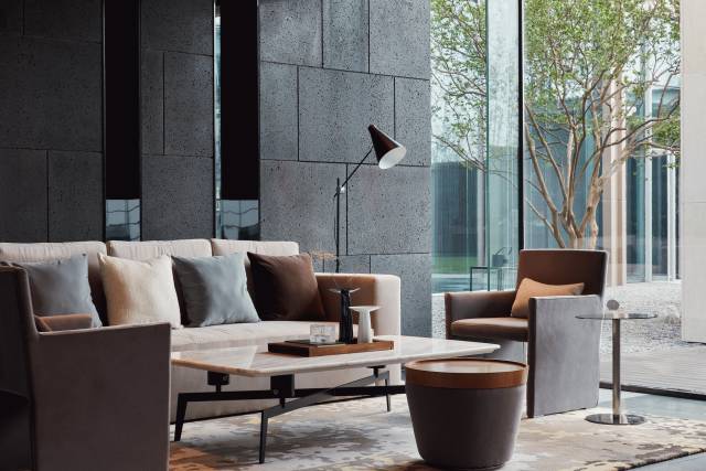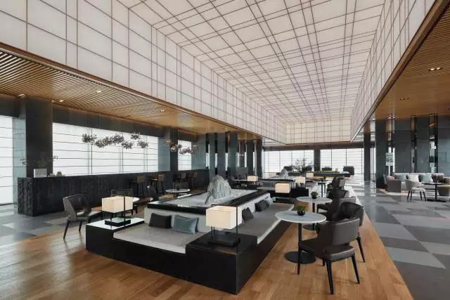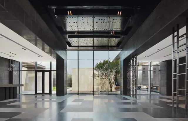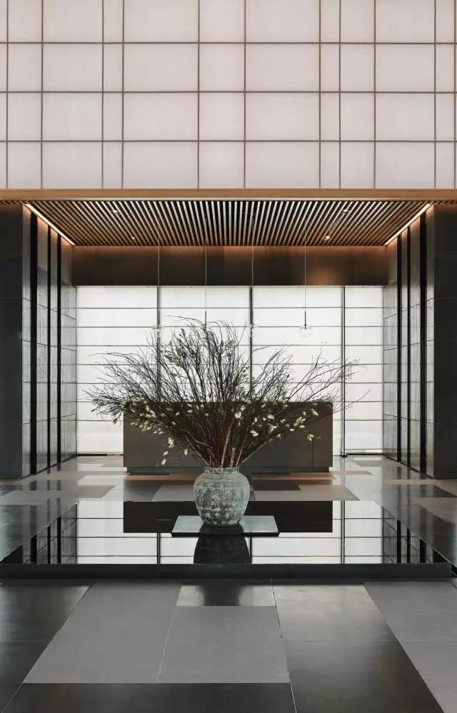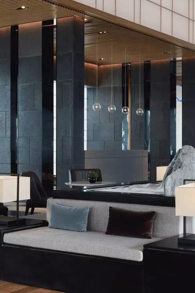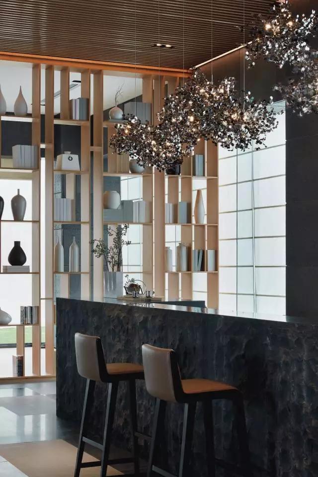 借由東方園林式的假山,打造出“未若柳絮因風起”的雪景,美如水墨畫、細膩至極。這與圍繞式洽談方式布置相結(jié)合,巧妙處理好空間形態(tài)和陳設之間的關(guān)系。大尺度挑高設計,加上頂部有序交互的線條,讓空間極具延展性,通透敞亮的照明效果搭配藝術(shù)性燈光點綴,使整體氛圍更顯大氣與品位。該空間通過主體、功能位置、通透的序列式的立面關(guān)系,自然分割空間視線,同時又實現(xiàn)了將光線引入到室內(nèi)的最大化。