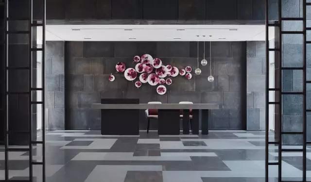 預接待吧臺與大廳講究整體的對稱平衡,通過巧妙的吧臺構(gòu)成形式、空間吊燈的位置,呈現(xiàn)靈動的立面關(guān)系,有效緩解空間的呆板。大面積深灰色石材,配以紫色壁飾花瓣式鋪灑開來,夾雜一絲神秘感,東方韻味無限彌散。