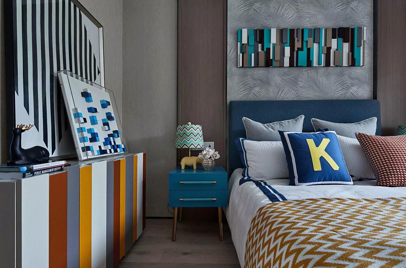 都市雅痞們的下一代,也必將是特立獨行,善于接受新事物的。所以在兒童房的設(shè)計中,加入了時下流行的樂高元素,不同色彩的積木條,不僅增添空間趣味性,也拉近了父母與孩子的距離。